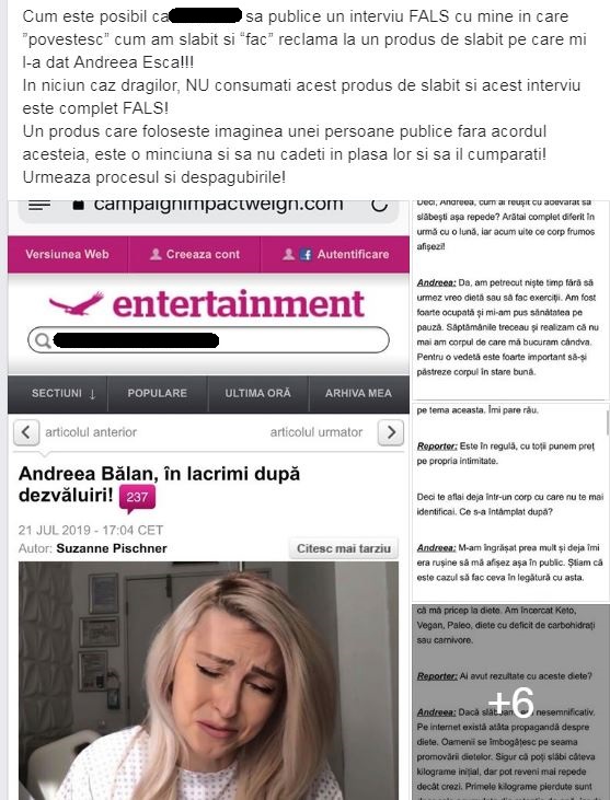 ” Cum este posibil ca să se publice un interviu FALS cu mine in care ”povestesc” cum am slăbit și “fac” reclamă la un produs de slăbit pe care mi l-a dat Andreea Esca!!! În niciun caz dragilor, NU consumați