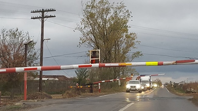 O bariera de la trecerea peste calea ferata, intre Timisoara si Sacalaz, pe drumul national spre Jimbolia, a fost semnalizata cu o lumanare pusa intr-un felinat de la mijlocul barierei.
