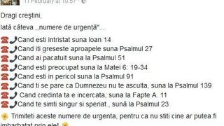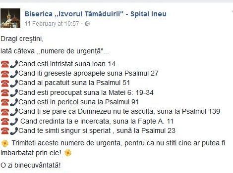Facut dupa calapodul numerelor de urgenta care apar pe ecran, pentru sustinerea diverselor promotii comerciale, mesajul se incheia cu textul "trimiteti aceste numere de urgenta pentru ca nu stiti cine ar putea fi imbarbatat prin ele!". Ulterior, realizand ca umorul nu face casa buna cu seriozitatea rugaciunii, administratorii contuluid e Facebook al bisericii din Ineu au scos postarea respectiva!