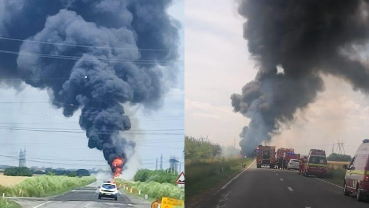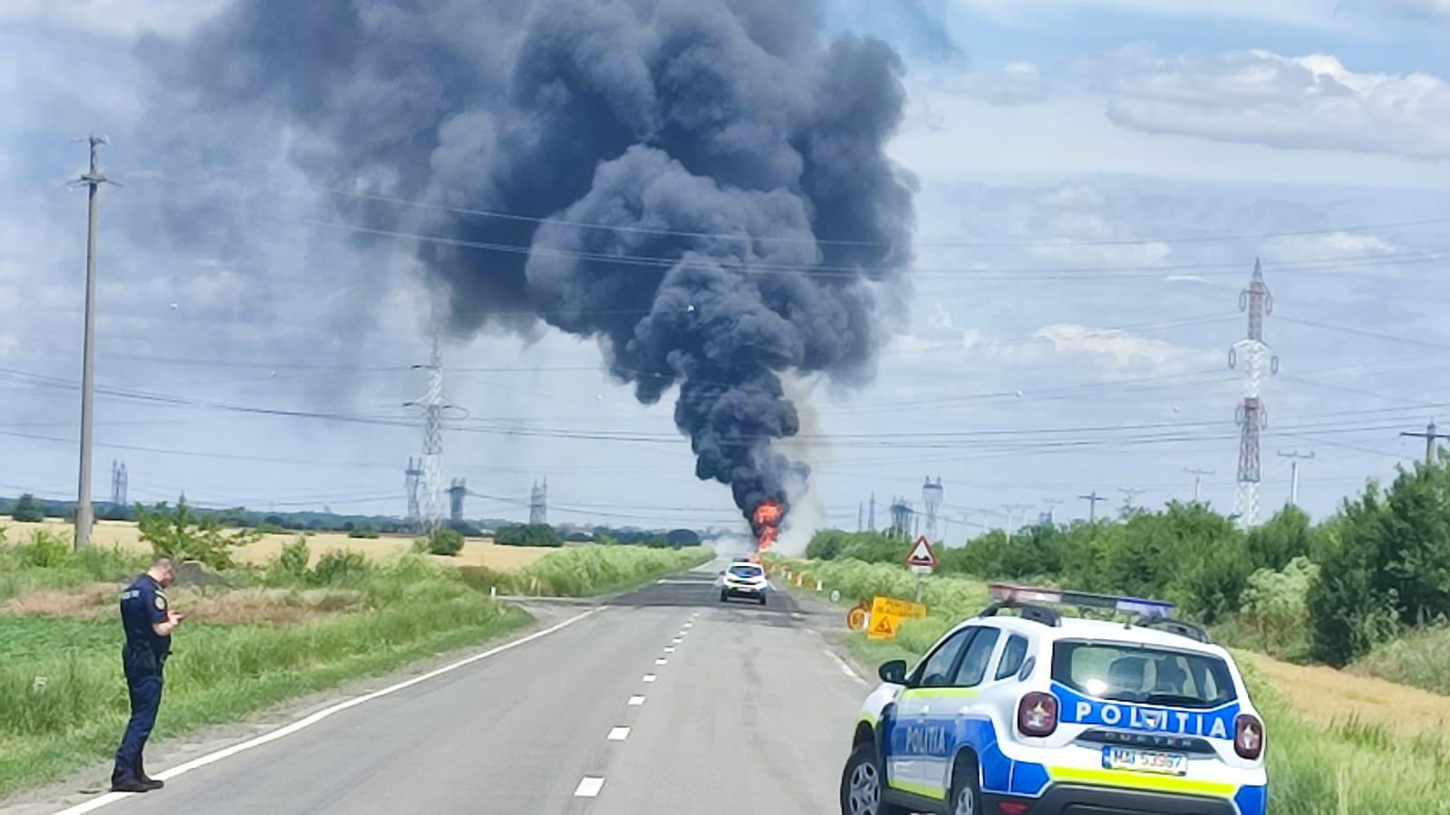 Un accident teribil a avut loc astăzi, pe DN2B, în Brăila. O cisterenă și un autoturism s-au ciocnit. În urma impactului, atât cisterna, cât și autoturismul au fost cuprinse de flăcări. Autoritățile au intervenit de urgență la locul faptei.
