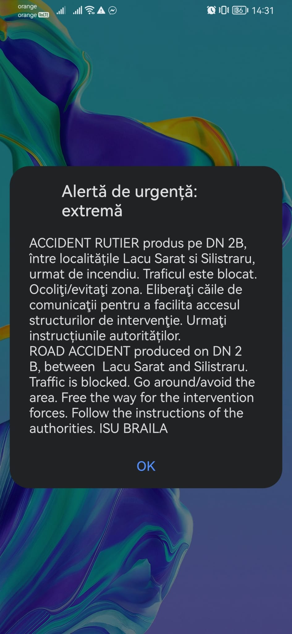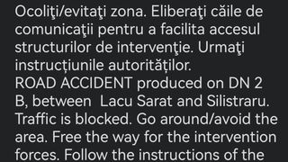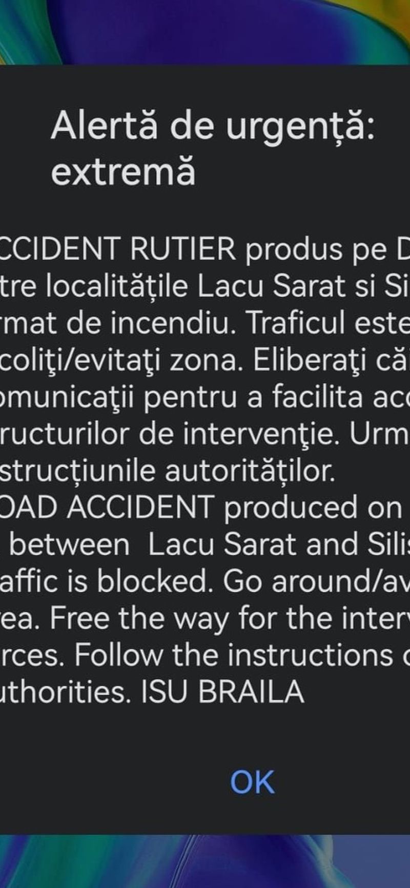 ISU Brăila a emis o alertă de urgență pentru a avertiza participanții la trafic cu privire la accident.