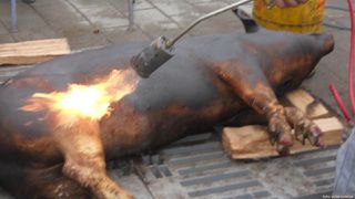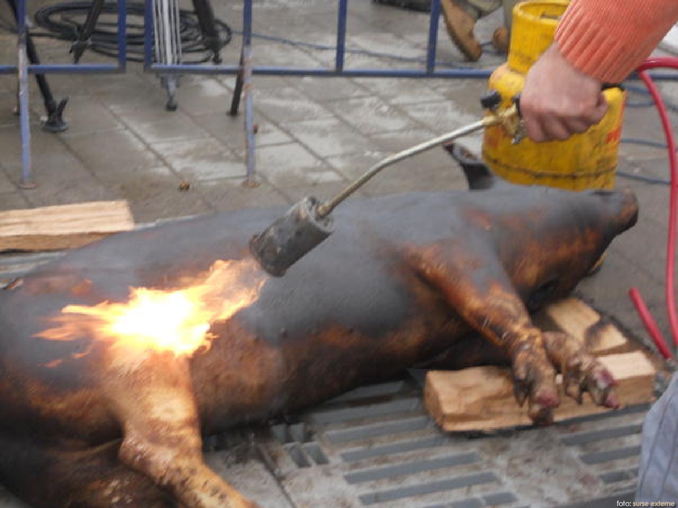 O familie din Galati si-a parlit, miercuri seara, porcul pe trotuar, intr-o zona centrala a orasului Galati, spre indignarea trecatorilor care au postat imaginile pe internet si au sesizat Politia Locala, in acest caz, o femeie, in varsta de 50 de ani, fiind amendata cu 200 de lei pentru ca a gatit pe domeniul public.