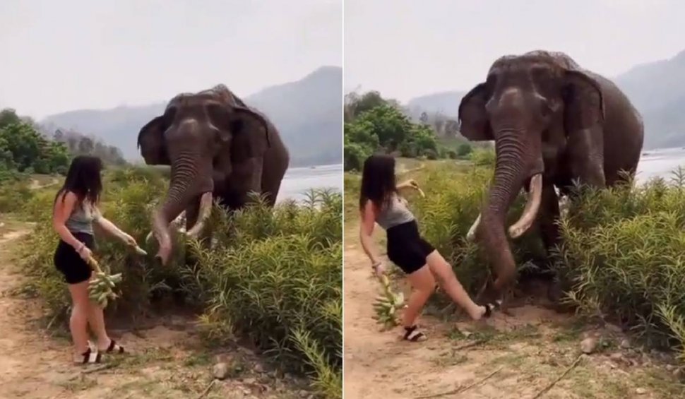 O glumă a unei femei s-a transformat într-o situație care se putea termina tragic. Aceasta a încercat să păcălească un elefant că îi oferă o banană. Supărat când a văzut că nu primește ceea ce i s-a promis, acesta a lovit-o pe femeie.