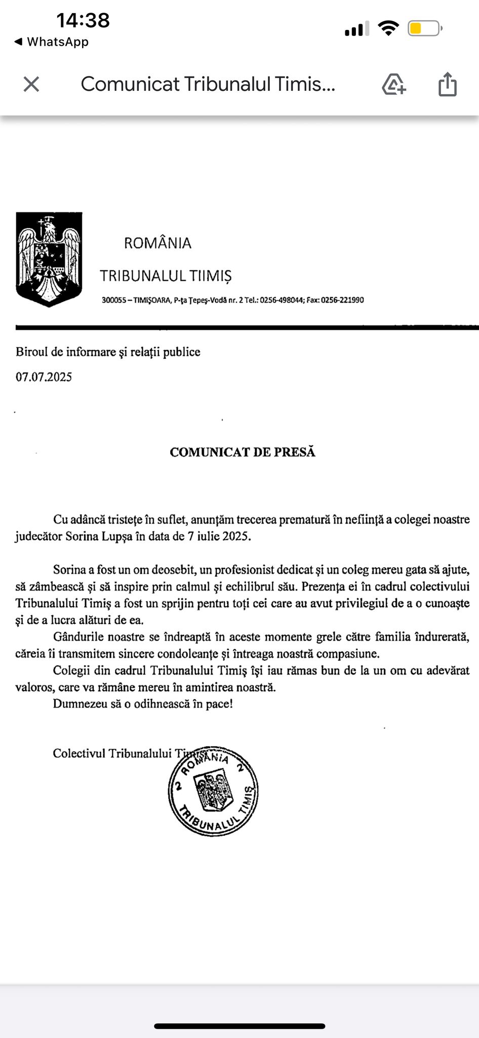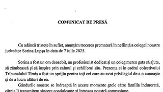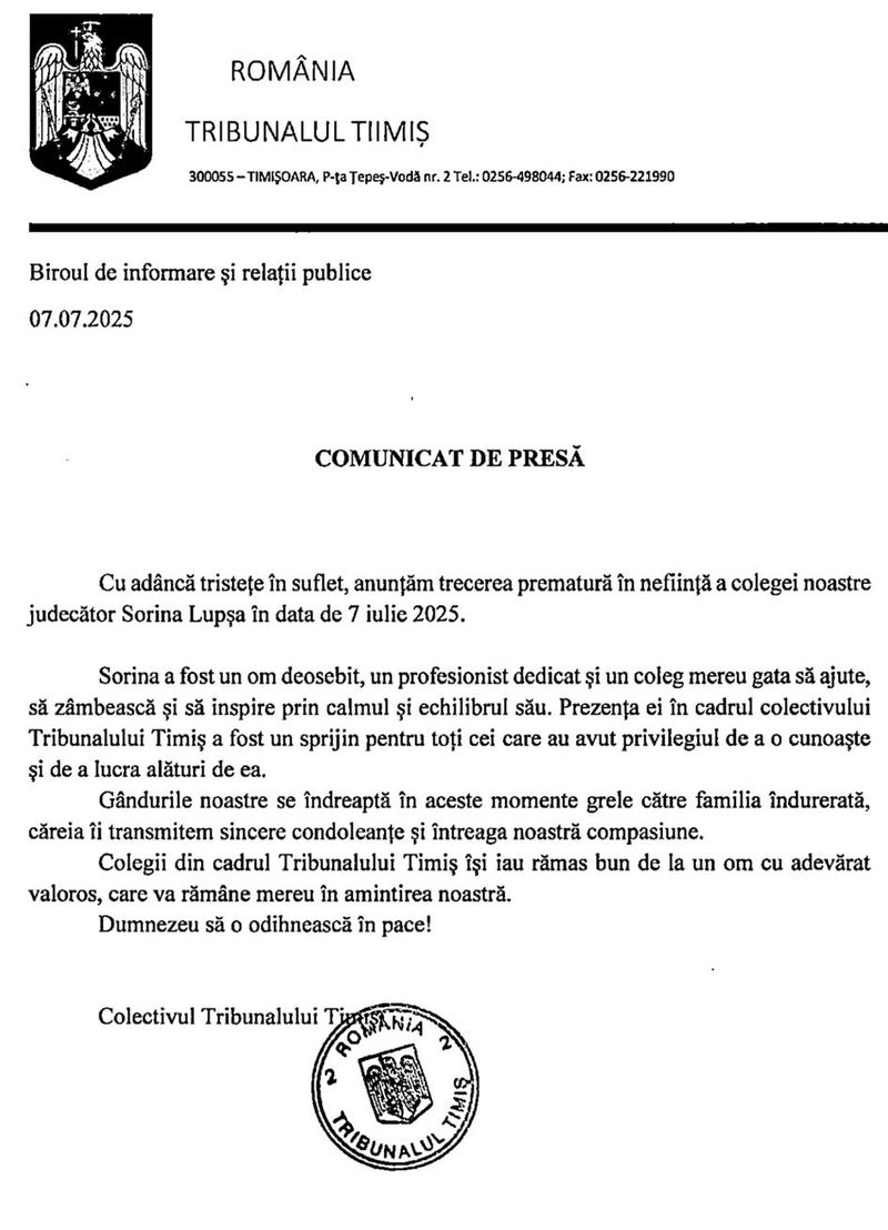 Femeia care a căzut în gol în dimineața zilei de luni, 7 iulie, de la etajul 7 al unui imobil din Timișoara, este Sorina Lupșa. În vârstă de 41 de ani, Sorina era judecătoare la Tribunalul Timiș, Secția Penală, fostă procuroare la PJ Timișoara.
