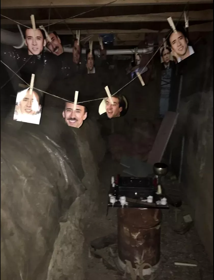 Omul a început sp lucreze, iar când a desprins bucățile, a descoperit un ”altar” dedicat celebrului actor de la Hollywood, Nicolas Cage, dar și mai multe sfori unde erau agățate poze cu celebrul actor. Un prieten a postat toată povestea pe rețelele de socializare.
