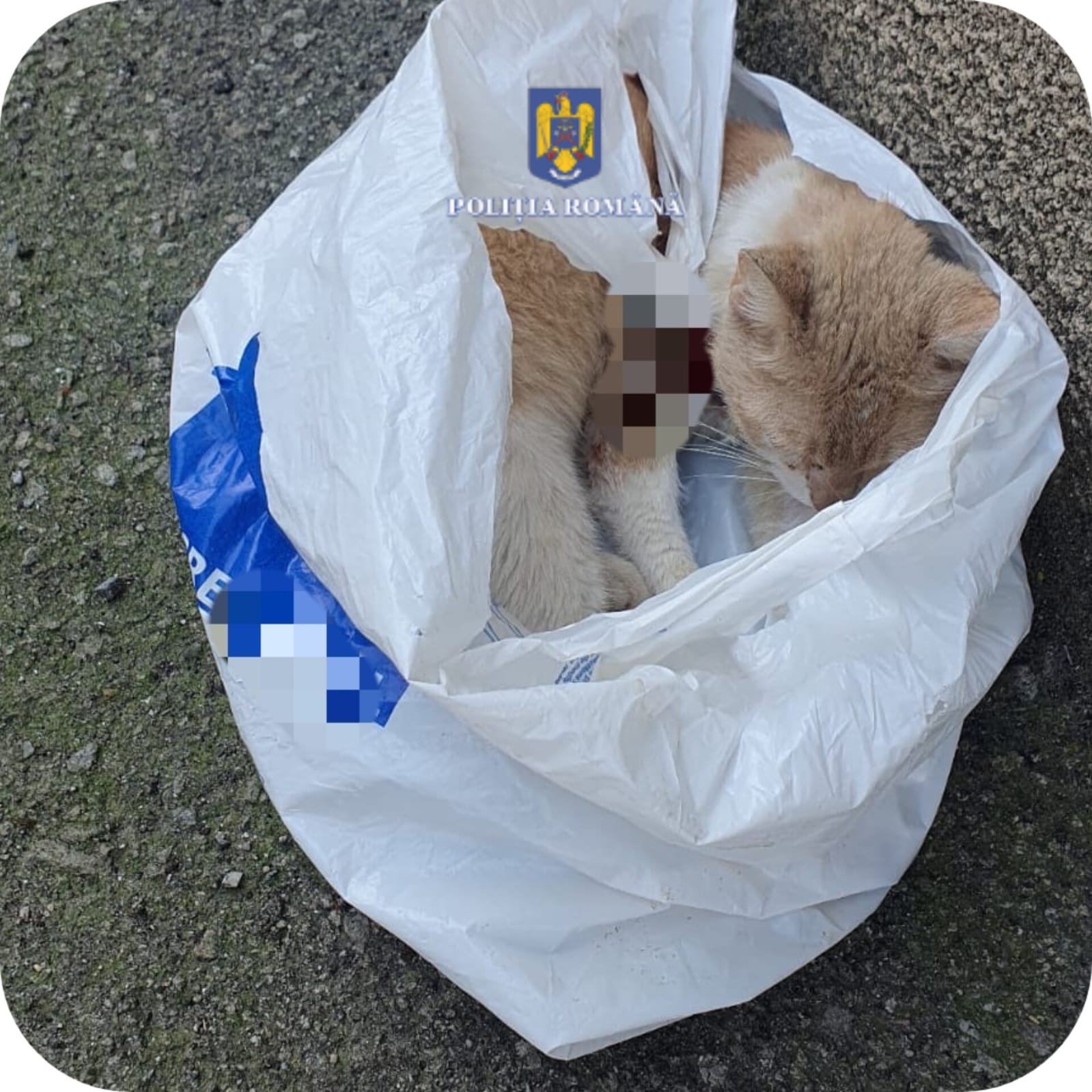 Polițiștii Biroului pentru Protecția Animalelor au fost sesizati despre faptul că o pisică rănită zăcea abandonată pe strada Libertății din Reșița, într-o pungă de plastic.