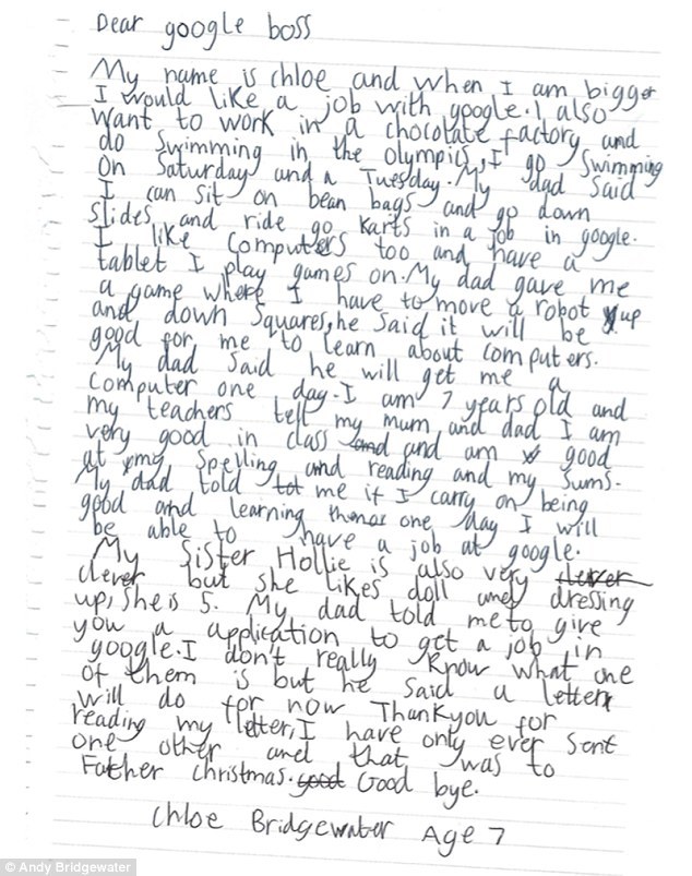 Chloe Bridgewater a trimis o scrisoare companiei Google in care isi exprima intentia de a lucra acolo. Copila, de numai 7 ani, a explicat si de ce isi doreste sa aiba un job in acest domeniu Partea frumoasa este ca CEO companiei i-a raspuns personal.