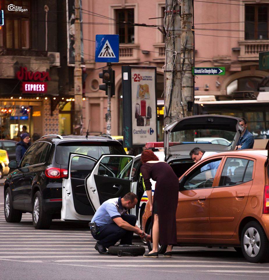 Soferita din Bucuresti a facut pana in centrul orasului, iar doi politisti au sarit in ajutorul ei. Fotografia a fost facuta de Octav Dragan si a fost publicata pe contul de Facebook al Politiei Romane.