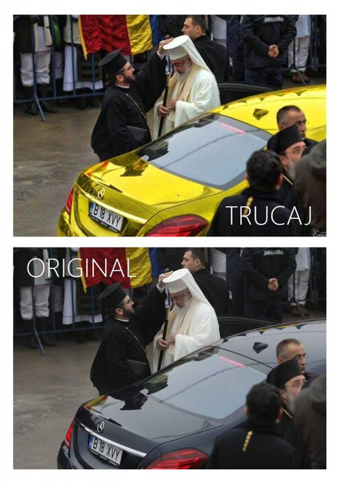 2 din 2 | O fotografie trucată cu Patriarhul Daniel venind într-o limuzină aurită la inaugurarea Catedralei Mântuirii Neamului a creat isterie pe Internet