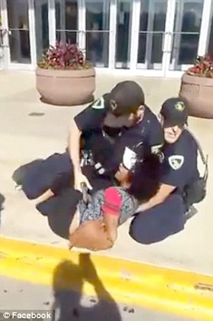 Imaginile au fost surprinsa in parcarea unui mall din Madison saptamana trecuta. Cei doi agenti de politie au retinut-o pe fata pentru ca ar fi intrat intr-un restaurant si a amenintat angajatii, relateaza Daily Mail. Ofierii de politie au pus-o la pamant si au lovit-o cu picioarele. Tanara tipa, insa cei doi barbati contina sa o chinuie.