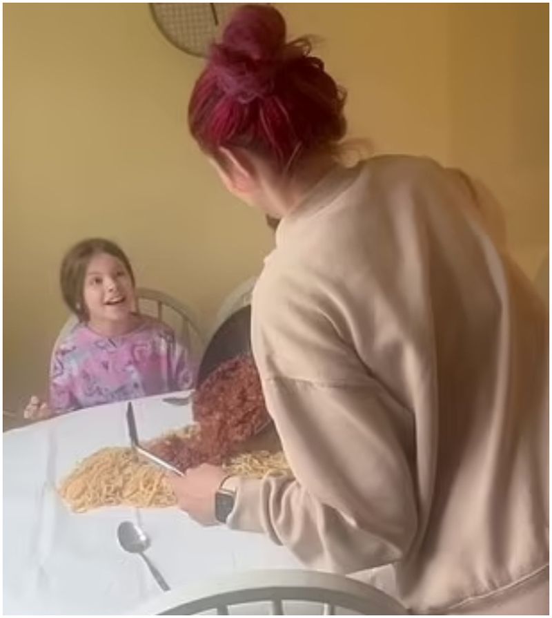 Filmările i-au surprins pe copiii derutați, în timp ce mămica lor pune mai întâi pastele, apoi sosul și chiftelele, direct pe fața de masă, în timp ce Willow și fiul ei de cinci ani privesc cu ochii mari.