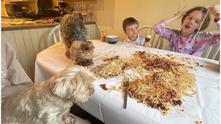 Pasul următor este ca toată familia să își abandoneze cuțitele și furculițele, iar cei trei Yorkshire Terrieri ai familiei s-au urcat și ei pe masă pentru a se alătura mesei neobișnuite.