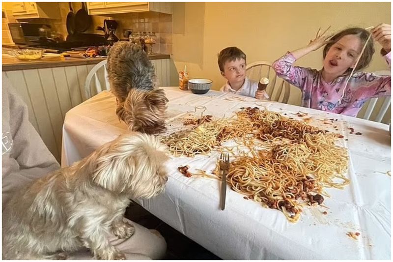 Mai ales că toți cei trei căței ai familiei au luat cu asalt uriașa porție de spaghete cu sos.
