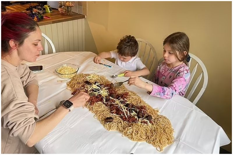 Mămica din localitatea Dunmow, Essex, a decis să nu mai murdărească farfuriile și a aruncat cină întreagă de spaghete pe masa din bucătărie- iar copiii ei au crezut că „mama are o criză”.
