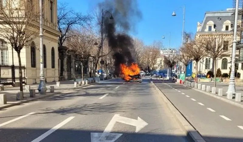 Mașină în flăcări, pe Calea Victoriei