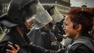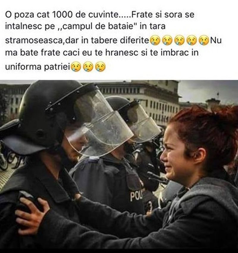Pe un grup creat de romanii din Spania pe retelele de socializare a fost postata o fotografie emotionanta. In imagine sunt surprinsi un jandar si o tanara. Realitatea este dura: cei doi sunt frati si se intalnesc "pe campul de lupta", dar in tabere diferite. Tanara, cu lacrimi in ochi, isi implora fratele jandarm sa nu o loveasca. Mesajul este sfasietor!