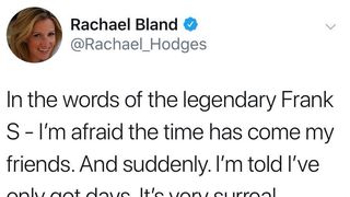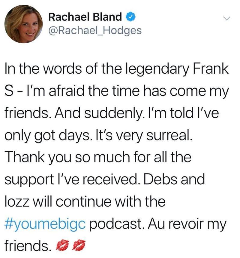 „Dupa cum spunea legendarul Frank S – Ma tem ca mi-a sunat ceasul, prieteni. Si dintr-o data, mi s-a spus ca mai am cateva zile de trait. Este ireal. Va multumesc pentru sprijin. La revedere, prieteni”, a scris Rachael Bland.