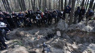 Journalists were shown the mass grave in the village of Motyzhyn in the #Kyiv region, which was found after the retreat of the #Russian military.