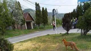 Un echipaj al Poliţiei Rutiere din Baia Mare a surprins imagini cu o vulpe care a furat o găină dintr-o curte de la marginea oraşului. Vulpea trece strada şi scapă găina, din cauza unei maşini care se apropie.