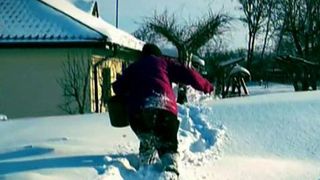 Sarmana bunica se chinuie si ea sa dea la lopata, in vreme ce noi ne facem loc prin zapada sa-i ajungem la poarta.