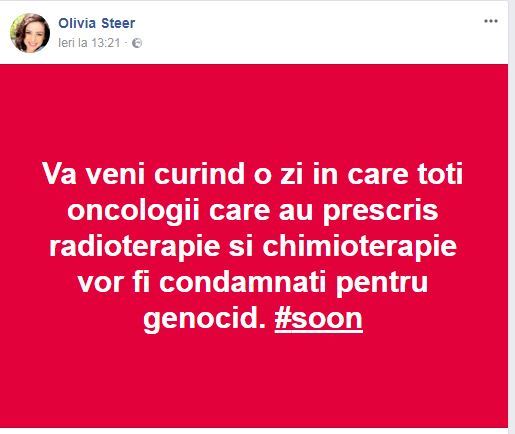 De data aceasta insa, Olivia Steer a avut o pozitie extrem de dura fata de medicii oncologi, prin care a reusit sa straneasca din nou controverse. Aceasta a postat un mesaj dur la adresa mediciilor oncologi care recomanda radioterapia si chimioterapia pentru bolnavii de cancer.