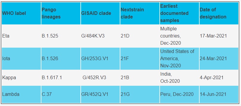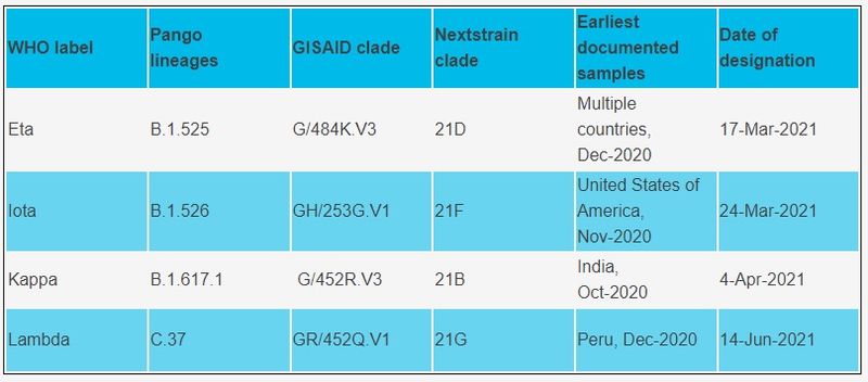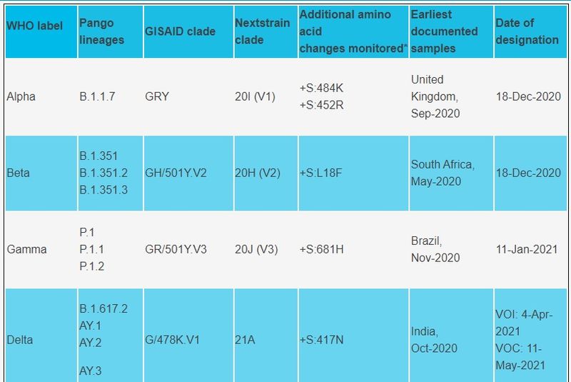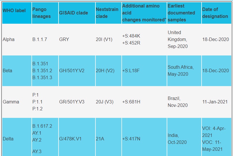 OMS a stabilit până în prezent patru variante ale coronavirusului care determină îngrijorare (Alfa, Beta, Delta şi Gama), alte patru variante de interes pe care le monitorizează, plus trei alerte.