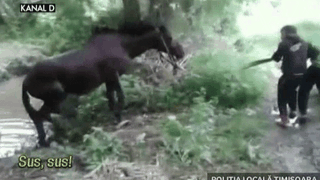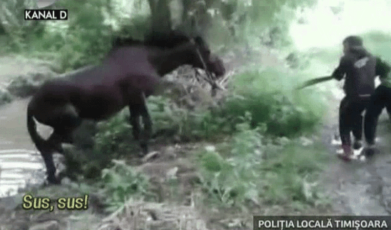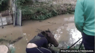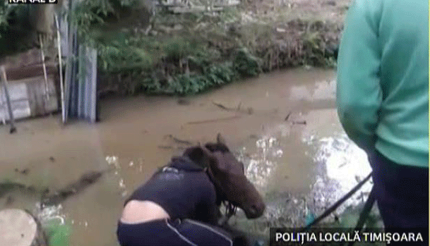 Operatiune foarte dificila, de salvare, la Timisoara. Un cal a cazut într-un sant adanc de doi metri, plin cu apa si noroi, apoi a ramas împotmolit. Si poate n-ar fi supravieþuit daca, nu sareau sa-l ajute politistii locali.