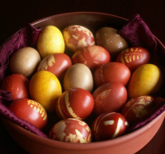 Ouă de Paște. Roşu – cu foi de ceapă. Păstrează foile şi „cămăşile” cepelor roşii curăţate, pe care le fierbi împreună cu ouăle timp de o jumătate de oră sau chiar o oră. Cu cât foloseşti mai multe foi de ceapă şi cu cât laşi ouăle la fiert mai mult timp, cu atât vei obţine o culoare mai puternică. Dacă foloseşti o cantitate mai mică de foi, vei obţine o nuanţă de mov sau lila.