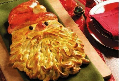 Ia bucata mai mare de aluat si da-i o forma de triunghi. Desigur, triunghiul nu va avea unghiurile perfect ascutite, ci rotunjite. Acesta reprezinta capul si caciula lui Mos Craciun.Ia bucata mai mica de aluat si imparte-o in doua. O parte trebuie modelata in forma de barba. Este simplu: foloseste un cutit cu care sa franjurezi aluatul ca si cum ai face niste onduleuri. Apoi lipeste barba de fata mosului (de bucata mare de aluat).
