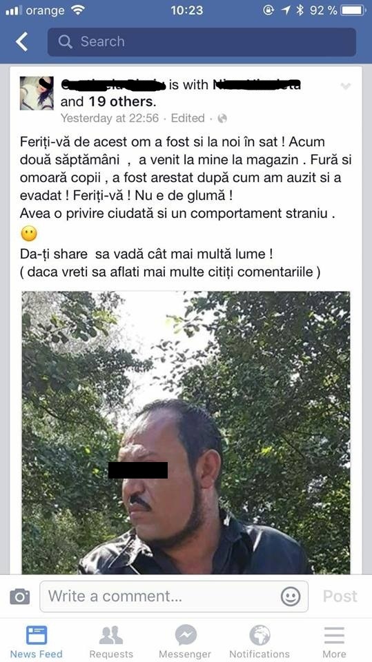 "Feriti-va de acest om, a fost si la noi in sat. Acum doua saptamani, a venit la mine la magazin. Fura si omoara copii, a fost arestat, dupa cum am auzit si a evadat. Feriti-va! Nu e de gluma! Avea o privire ciudata si un comportament straniu. Dati share sa vada cat mai multa lume", a fost mesajul inconstient al unei tinere, care s-a viralizat rapid.