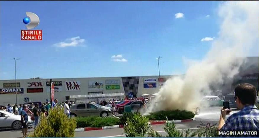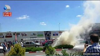 Panica in parcarea unui mall din Galati. O masina a luat-o singura la vale, a lovit un alt autoturism si apoi a luat foc. Chiar daca oamenii au folosit prompt stingatoarele, tot s-a produs explozia.