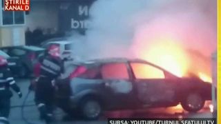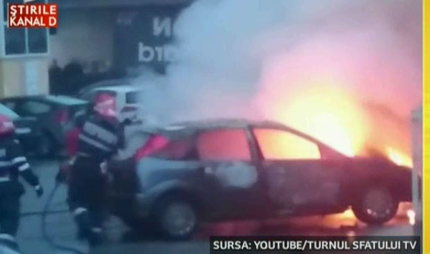Desi pompierii fac tot posibilul sa le stinga si se apropie periculos de mult, focul cuprinde cu repeziciune un alt autoturism care stationeaza la mai putin de un metru distanta.