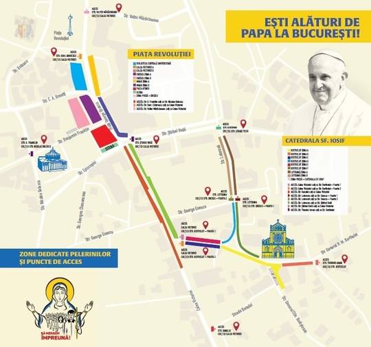 În afara celor 19 sectoare dedicate pelerinilor, va exista o zonă „liberă”, de unde cei care nu s-au înscris online să poată asista la evenimentele din Piaţa Revoluţiei.