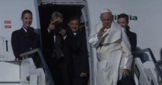 Papa în România 2019. Papa Francisc si-a inceput ziua pe aeroportul Fiumicino, de langa Roma. A ajuns la aeronava intr-o masina modesta, dar.... la intrarea in avion, s-a vazut incurcat de vantul puternic. Marginile vestmantului alb i-au acoperit fata pentru cateva clipe, moment inregistrat de toate camerele de filmat. Papa Francisc nu s-a aratat deranjat. A zambit si apoi i-a salutat pe membrii echipajului de bord.