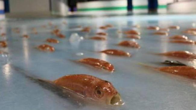 Pestii, crabii si celelalte crustacee au fost cumparati de la o piata locala de peste si erau deja morti inainte de a fi congelati in gheata patinoarului.