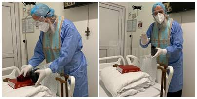 „Dacă îmbrac halatul lung „170”, reverenda rămâne pe mine. Pun trei rânduri de ciupici, trei măști, trei perechi de mănuși și trei capeline. Când secția nu este de halat „170”, iau combinezon. Cu combinezon nu mai pot să îmbrac și reverenda. Patru genți port în mașină – geantă Covid, geanta non-Covid pentru cronici, pentru maternitate și pentru ceilalți bolnavi. Au fost zile în care am mers și de șapte, opt ori la bolnavi. Acum vin de la Infecțioase, de la o doamnă”, a mai explicat omul bisericii.