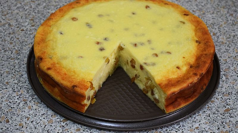 Punem stafidele la înmuiat în alcool, cât să le acopere. Dacă nu vă place alcoolul, puneți-le în apă caldă. Cu cât mai caldă, cu atât se vor înmuia mai repede. Se separă gălbenușurile de albușuri și se amestecă gălbenușurile cu brânză de vaci, zahărul, stafidele, coaja de lămâie, și vanilia. Amestecăm bine până se omogenizează compoziția. Se adaugă făina cernută și amestecată cu praful de copt și un praf de sare.