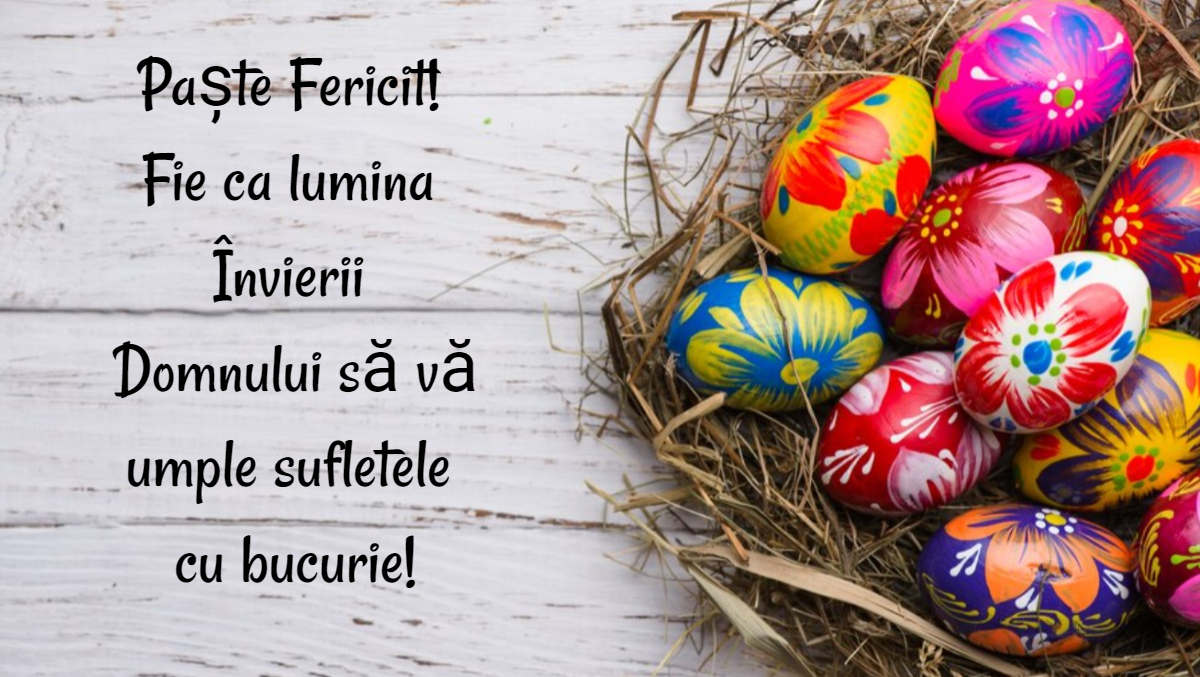 „Paște Fericit! În această zi specială, Mântuitorul să îți aducă lumină, încredere, iubire, speranță și sănătate! Să ai parte de momente superbe alături de cei dragi, iar viața să-ți fie plină de realizări! Hristos a Înviat!”