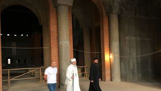 Imbracat complet in alb, asa cum este tinuta oficiala a sefului Bisericii Ortodoxe Romane, patriarhul a fost plimbat prin mai multe zone, multe dintre ele fiind deja gata.