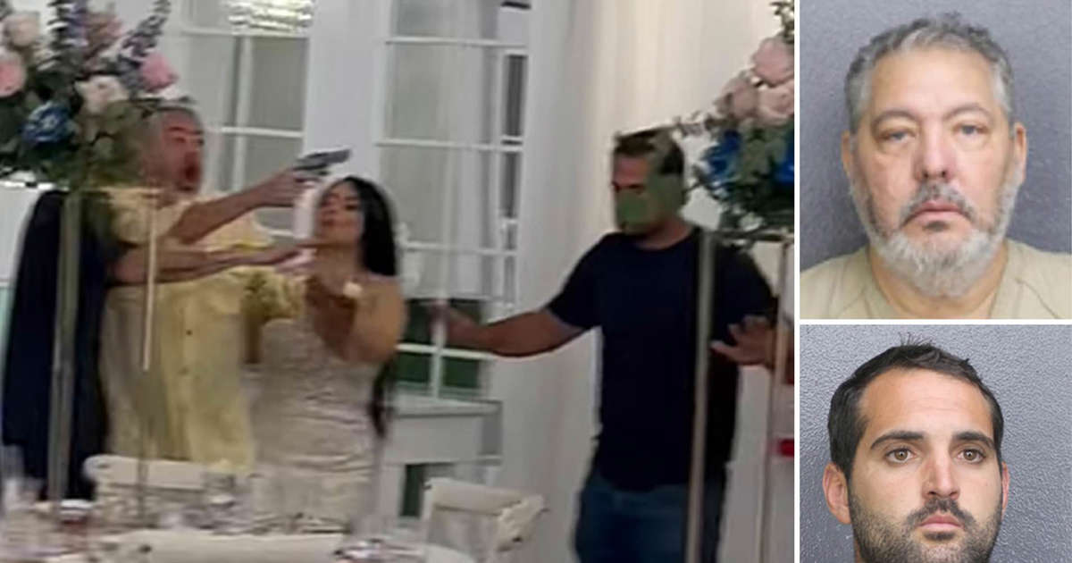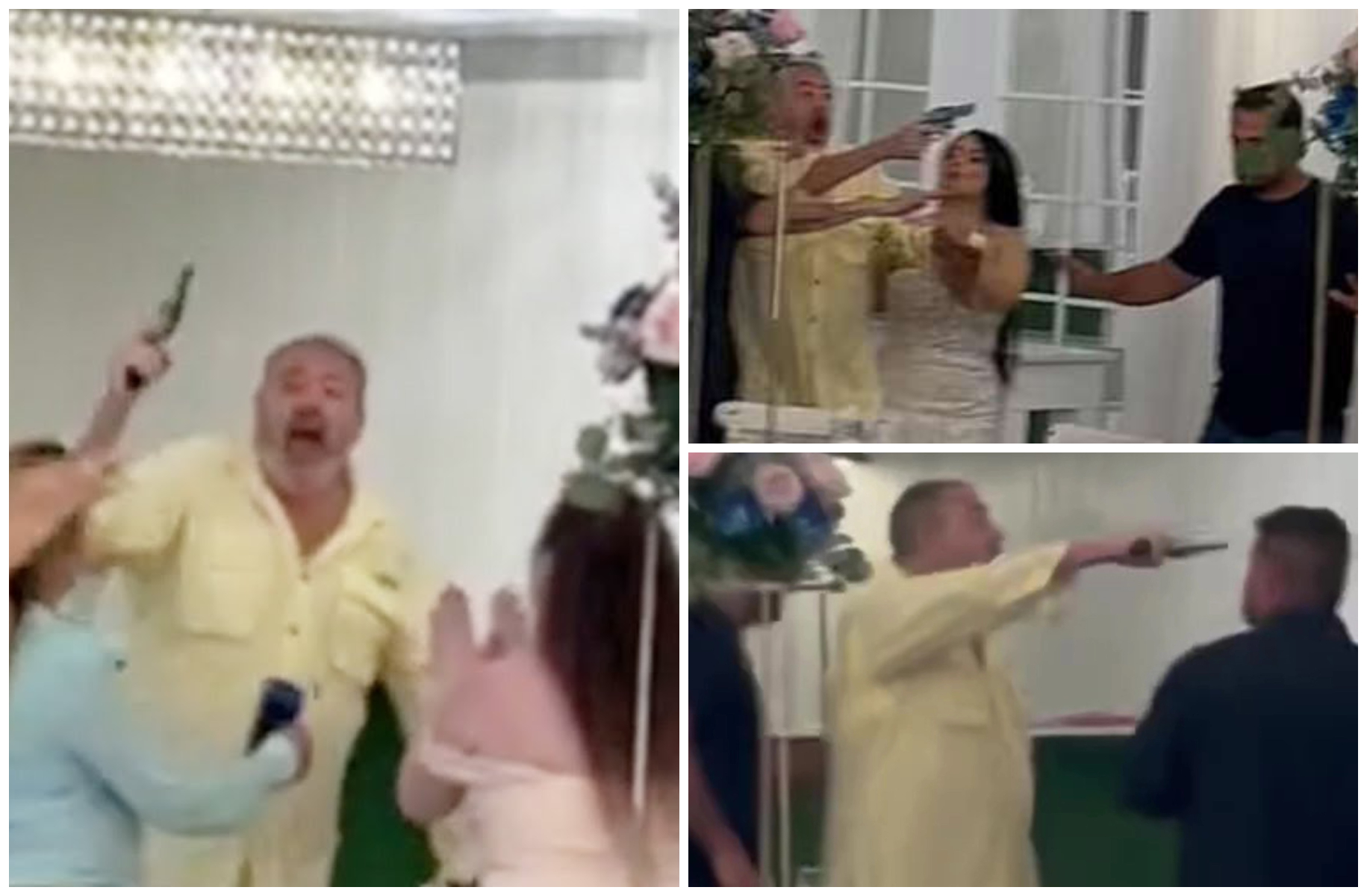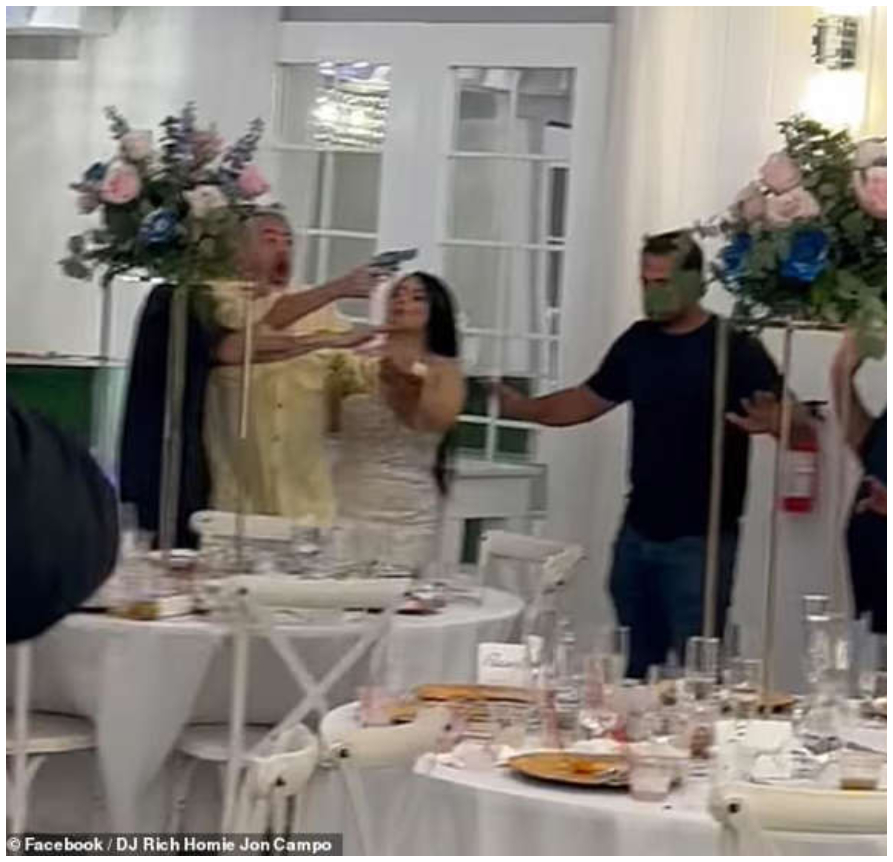 Videoclipul  postat de DJ-ul Jonathan Campo, vărul miresei, îl arată pe patronul enervat fluturând arma și strigând la oaspeții îngroziți să iasă din loccația sa.