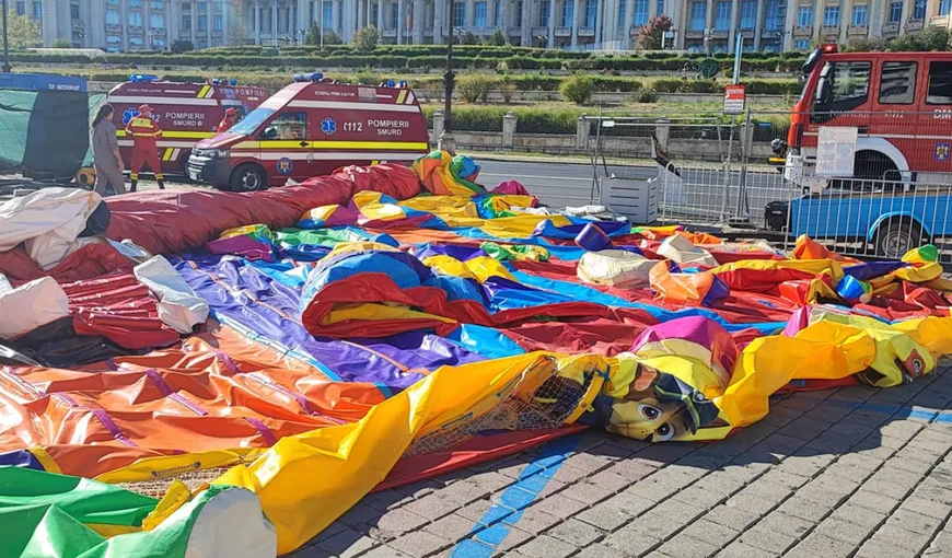 1 din 4 | Patru copii, răniți după ce vântul a luat pe sus un tobogan gonflabil din Piața Constituției
