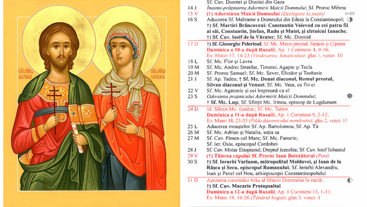 Sfinții Mucenici Adrian și Natalia, soț și soție, sunt pomeniți în calendarul ortodox în fiecare an pe 26 august, iar în anul 2025 această zi cade într-o marți.
