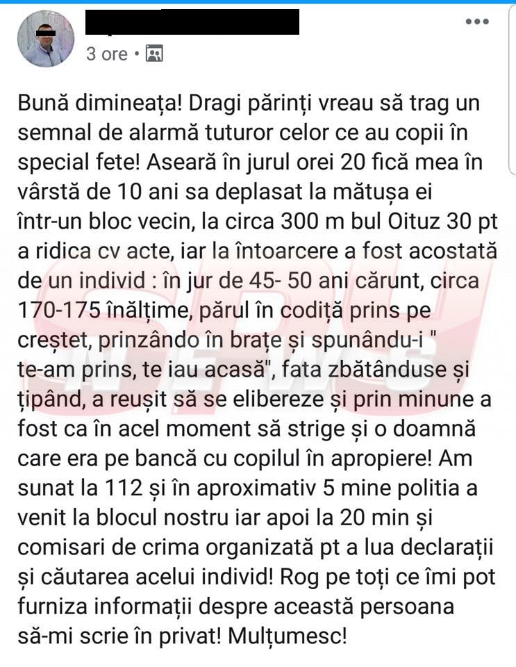 Locuitorii din Oneşti sunt în alertă de gradul zero, după ce tatăl unei fetiţe a dezvăluit, pe o reţea de socializare, că fetiţa lui a fost acostat de un individ dubios, care a atins-o într-un mod nefiresc.