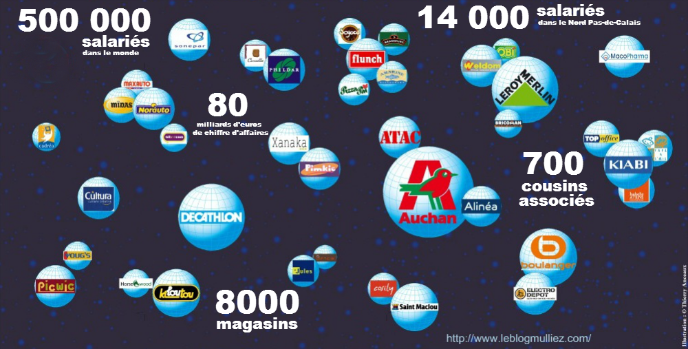 Potrivit digi24, consortiul creat in 1961 are 50 de societati, o jumatate de milion de angajati, 80 de miliarde de euro cifra de afaceri si este detinut de 650 de membri ai familiei Mulliez, toti milionari in euro.