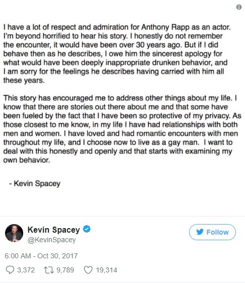 Actorul isi incepe declaratia publica spunand ca il respecta enorm pe actoryk Anthony Rapp si ca nu-si aminteste cele povestite de el. “Dar daca m-am comportat asa cum povesteste el, ii datorez cele mai sincere scuze pentru ceea ce a fost un comportament profund gresit in urma consumului de alcool.” – a scris Kevin Spacey pe Twitter.
