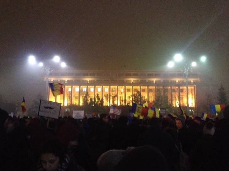 Protestul a inceput dupa ora 19.00, cu intonarea Imnului National. Cei prezenti au steaguri tricolore si pancarte cu mesaje ca ”Noaptea, ca hotii”si ”Vrem justitie, nu coruptie”.