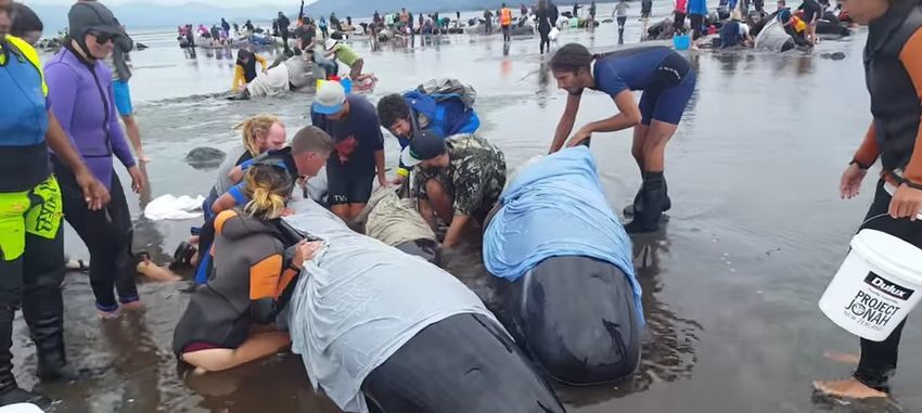 Pe coastele Noii Zeelande esueaza cele mai multe cetacee din lume: 300 de delfini si balene sfarsesc pe plaje in fiecare an, potrivit Project Jonah. Multe dintre aceste incidente au loc pe Farewell Spit. Expertii spun ca apele de mica adancime le induc in eroare pe balene si nu le permit sa inoate.