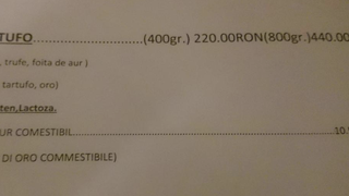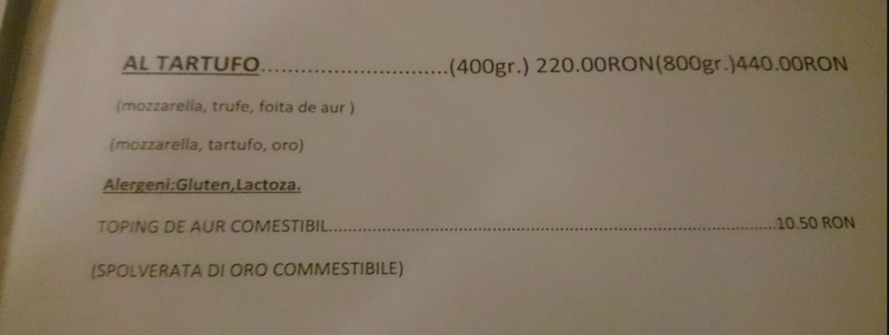Pizza se numeste Al Tartufo si contine trufe, mozzarella si foita de aur, iar topingul este din aur comestibil. Pretul unei astfel de pizze speciale este de 440 de lei, adica circa 100 de euro, dar fara toping. Pentru acesta se plateste in plus 10,50 lei. Este adevarat ca pizza are 800 de grame, una la jumatate costa “doar” 220 de lei.