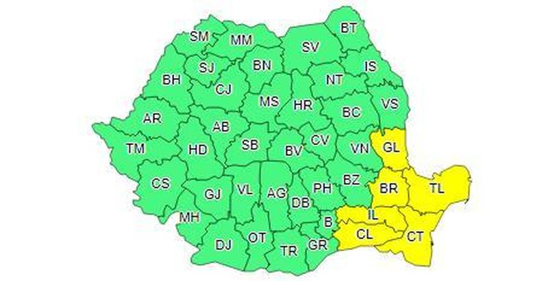 Meteorologii au emis o avertizare cod galben de ploi si instabilitate atmosferica accentuata, de joi de la pranz pana vineri, la ora 12.00, pentru judetele Calarasi, Ialomita, Braila, Galati, Constanta, Tulcea.