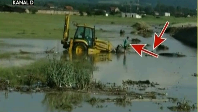 Cu un cablu in mana, un barbat incearca sa-l prinda cumva de autoturismul aproape inghitit de ape. Inoata pana la masina, apoi se urca pe capota si...leaga cablul. Un coleg reuseste sa-l traga pana la urma cu un excavator.